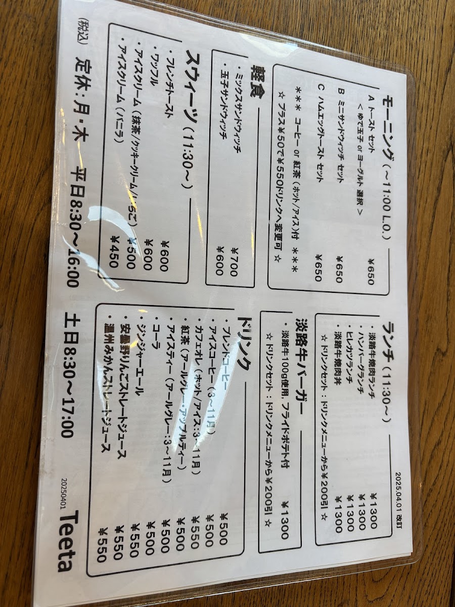 Welcome to Teeta, a charming café nestled on a hillside in Minamiawaji, Hyogo, where stunning ocean views await. This cozy spot is perfect for those seeking a tranquil retreat away from typical tourist hotspots. The menu features delectable offerings, including their signature 淡路牛バーガー, crafted with thinly sliced, juicy Awaji beef that delivers a unique savory experience. Diners rave about the fluffy burger buns and crispy fries that accompany their meals.
